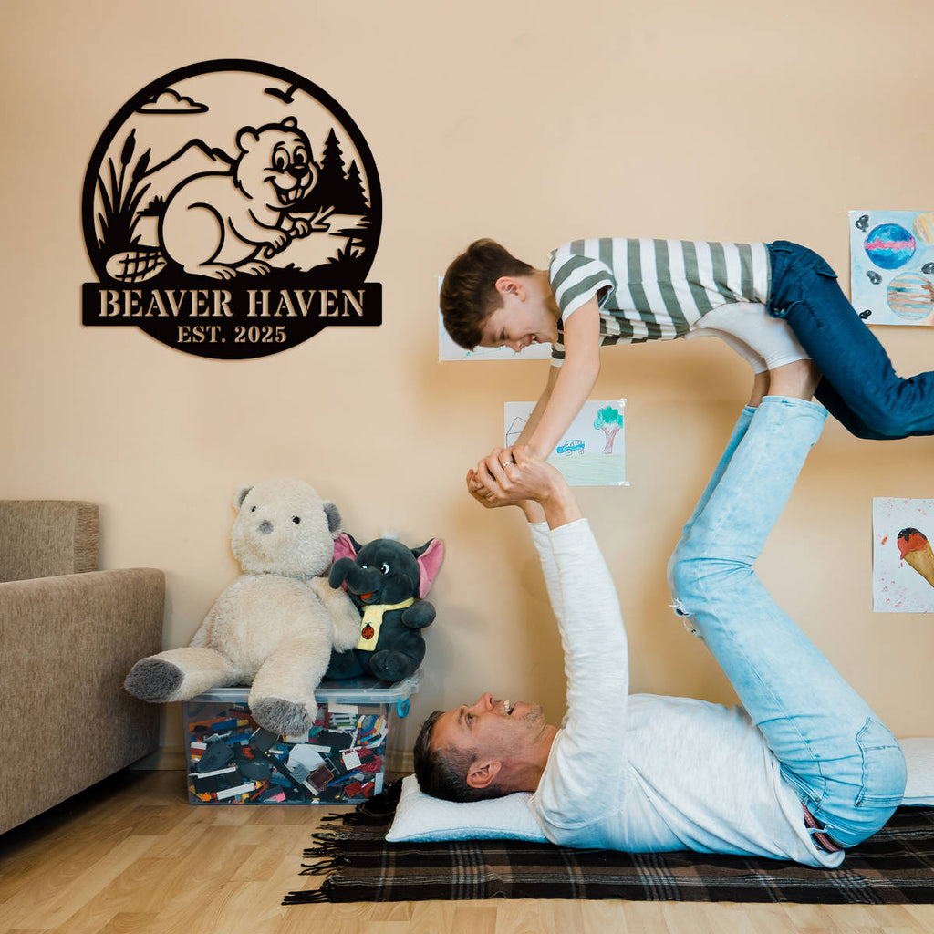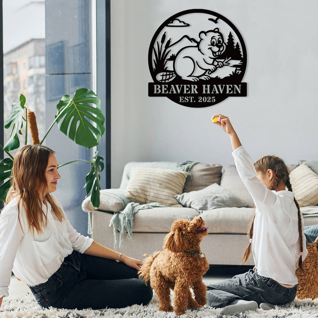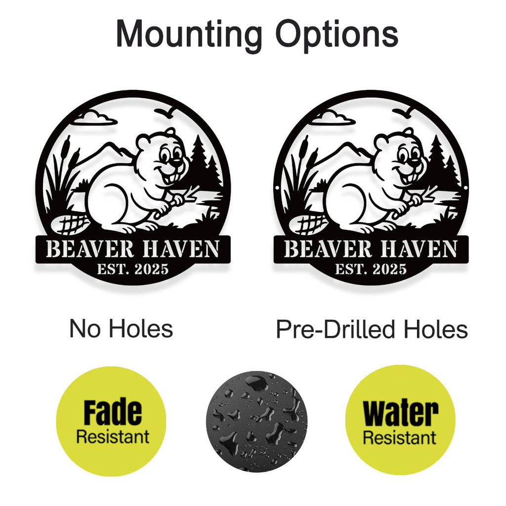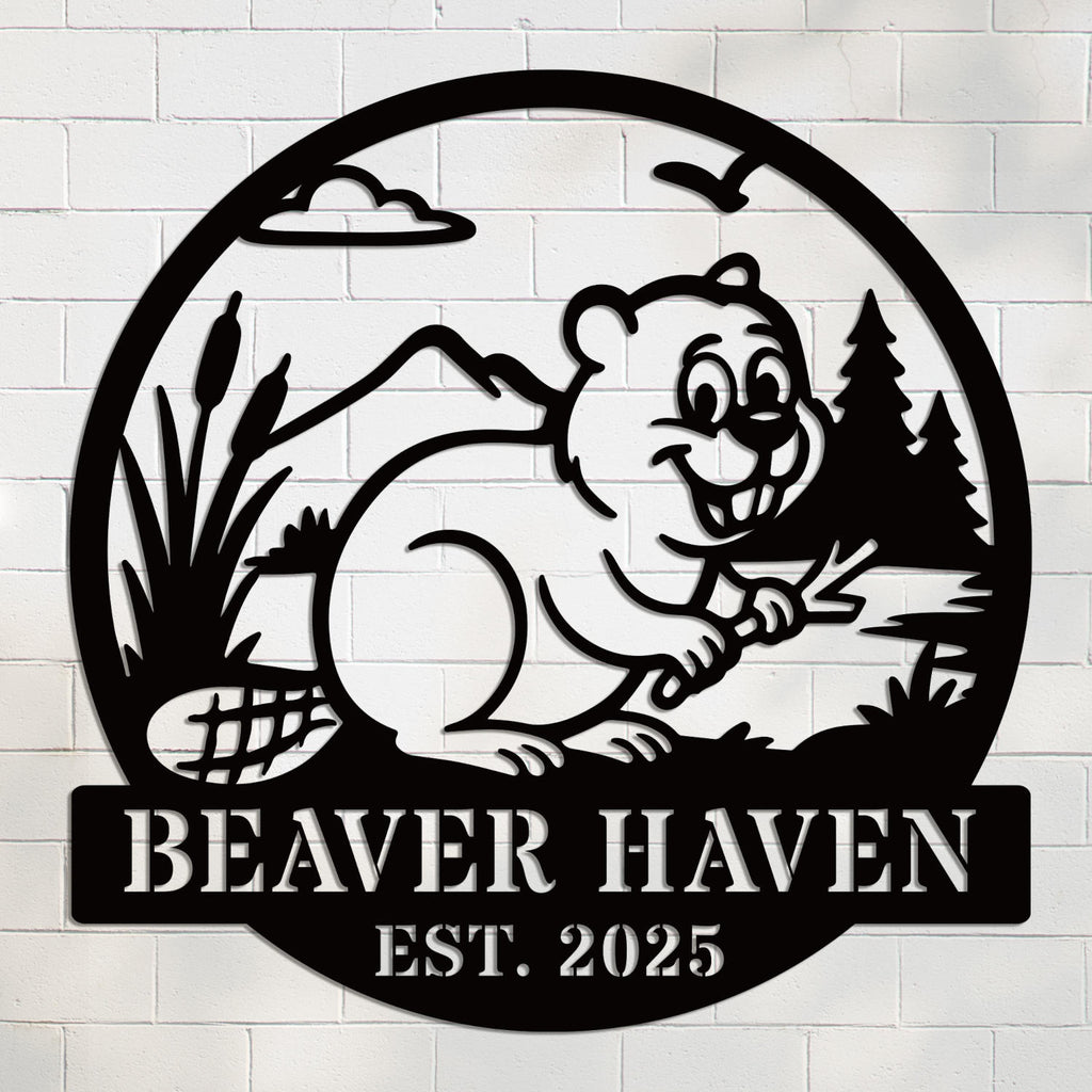 Add a touch of rustic charm to your home or cabin with this personalized beaver wall sign, crafted from high-quality steel. Each piece is laser cut for perfect detail and finished with a durable powder coat in the color of your choice. Featuring a cheerful beaver and natural scenery, it’s ideal for creating a warm, welcoming space. Customize the text with your family name, cabin name, or special phrase. Available in multiple sizes and colors, this sign is built to last indoors or outdoors. With pre-drilled mounting options, it’s easy to hang anywhere. Makes a thoughtful, one-of-a-kind gift!