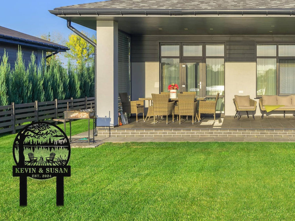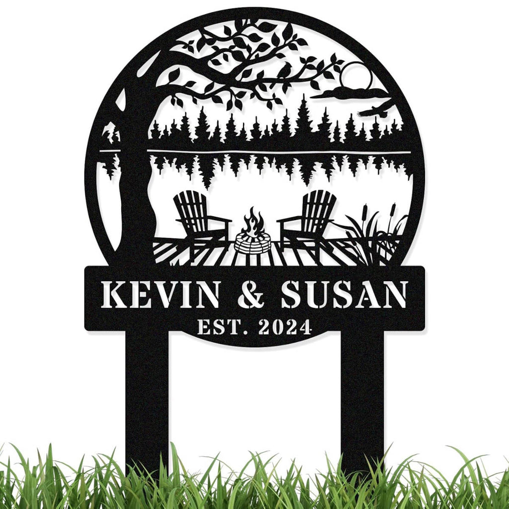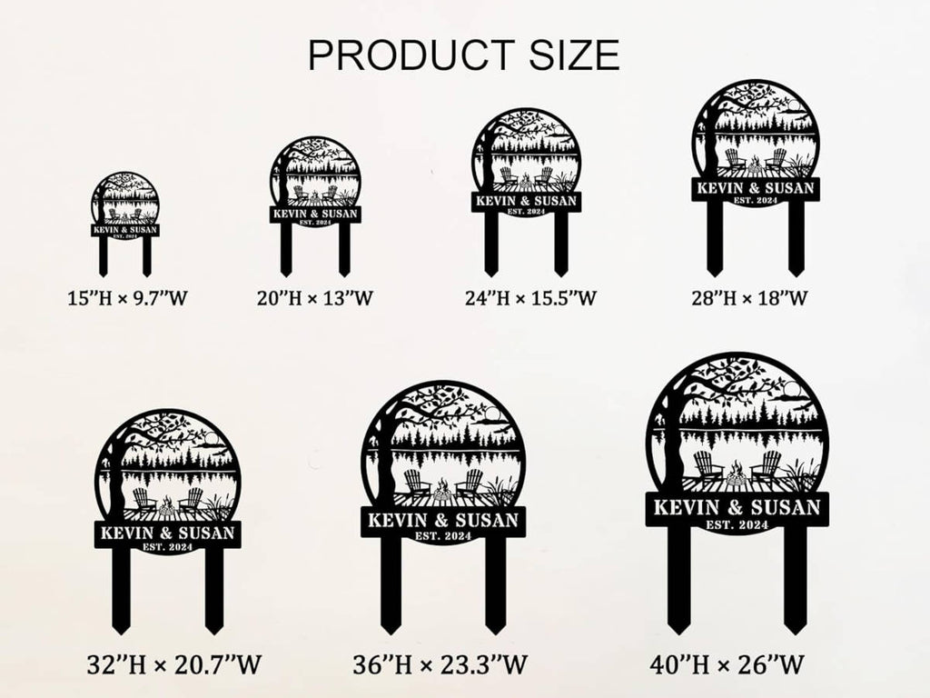 Celebrate your love for the great outdoors with our custom Lakefront Metal Sign, designed to capture the serenity of lakeside living. This stunning piece features a peaceful lake scene with Adirondack chairs by a campfire, surrounded by trees, and a beautiful sunset. Made from 14-gauge steel, this sign is expertly laser-cut for precision and detail. After cutting, the surface is cleaned and powder-coated, ensuring durability and a sleek finish. Personalize the sign with your names and anniversary date, making it a perfect addition to your home or cabin. Available in multiple sizes and colors, each sign comes with pre-drilled holes for easy wall mounting or can be displayed with the included stakes for yard installation. Whether it's for your own home or as a thoughtful gift, this custom sign adds a unique, personal touch to any space.