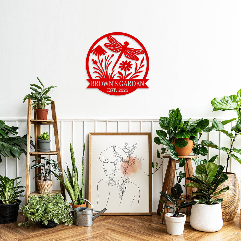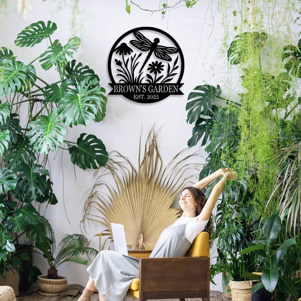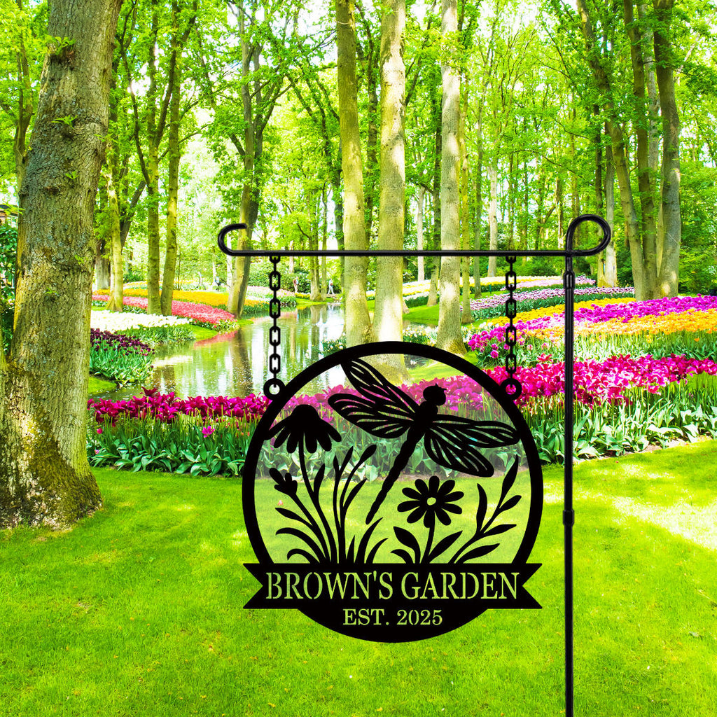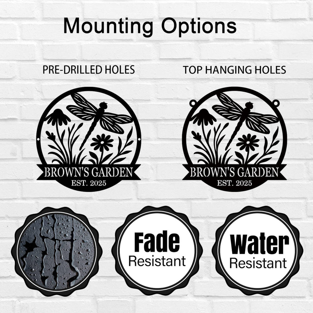 Bring nature's beauty to your outdoor space with this personalized dragonfly garden sign. Made from high-quality steel, each piece is laser cut for precision, then cleaned and powder coated for a durable, weather-resistant finish. The design features a graceful dragonfly among wildflowers, adding charm and elegance to any garden. Customize the text to make it truly yours—perfect for commemorating a special date or name. Available in multiple sizes and colors, this sign includes pre-drilled holes for easy wall mounting. Ideal for garden lovers, nature enthusiasts, or as a thoughtful gift.