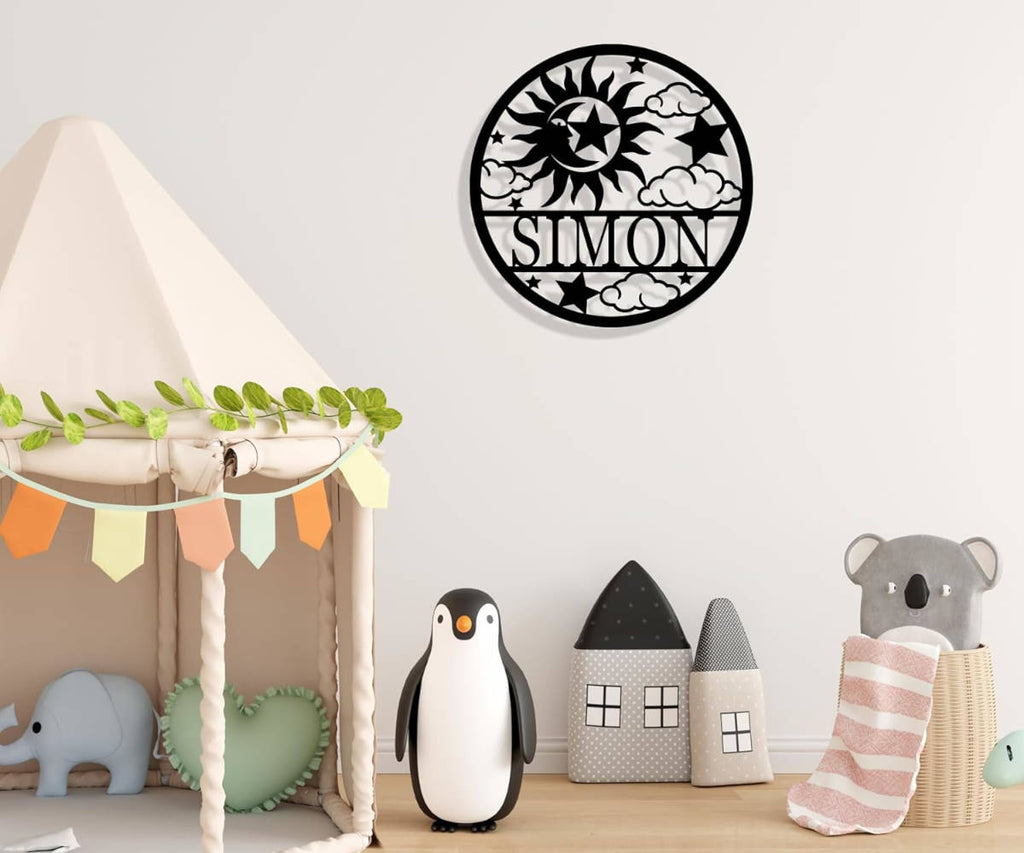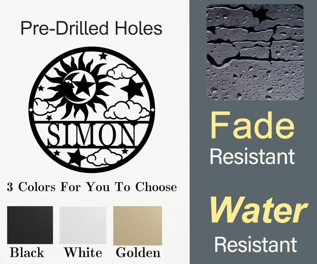 Introducing our Custom Metal Wall Sign featuring a unique sun, moon, and stars design. Perfect for adding a personal touch to your space, this metal sign is crafted from durable 14-gauge steel. Each sign undergoes a meticulous process starting with precision laser cutting, followed by thorough surface cleaning, and finished with a protective powder coating. The text on this sign is fully customizable to suit your preferences. Available in multiple sizes and colors, this sign comes with pre-drilled holes for easy wall mounting. Ideal for home decor, special events, and personalized gifts.