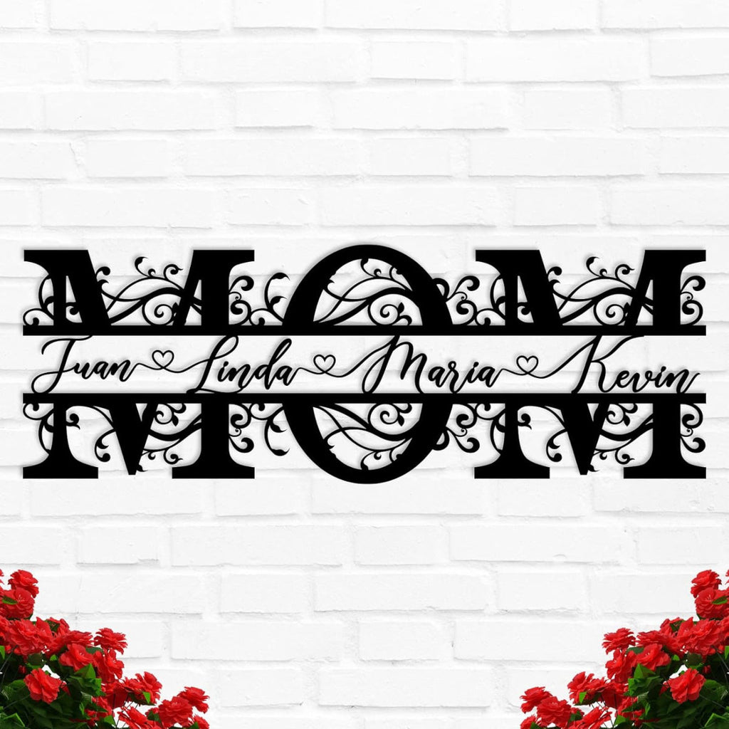 Celebrate the special bond between a mother and her children with this beautifully designed custom MOM sign. Crafted from 14-gauge steel, this sign features intricate scrollwork and personalized names, making it a perfect gift for Mother's Day, birthdays, or any occasion to show your love and appreciation. The sign is created using laser cutting technology, ensuring precise details and a high-quality finish. After cutting, the sign undergoes a thorough cleaning process and is powder coated for durability and a flawless look. Available in multiple sizes and colors, with pre-drilled holes for easy wall mounting.