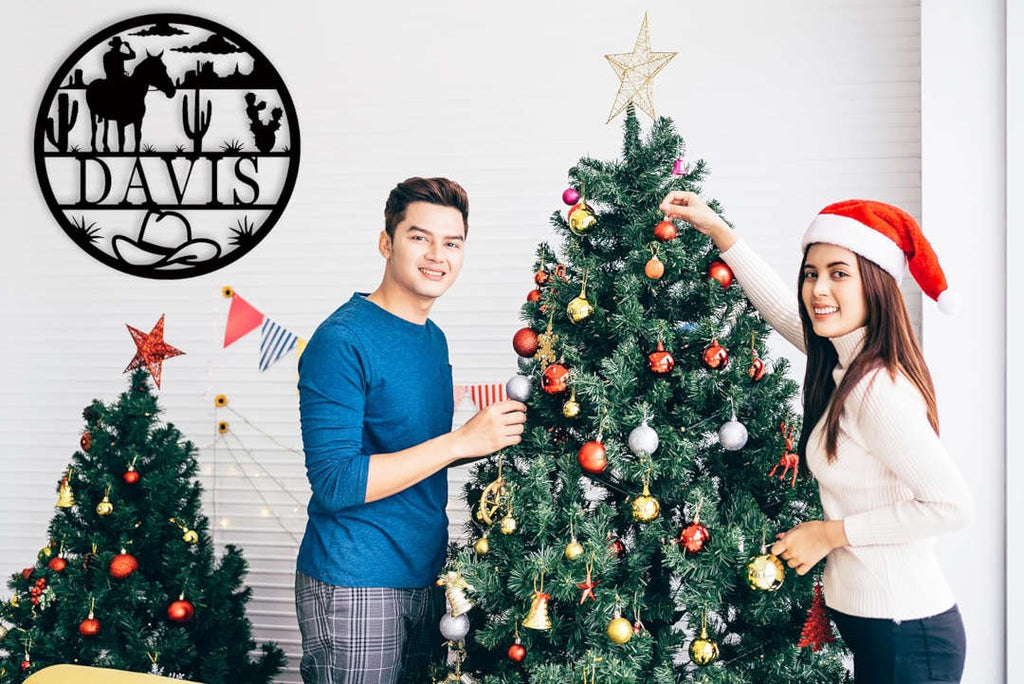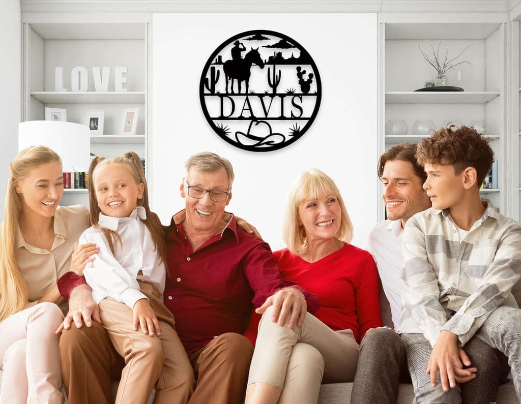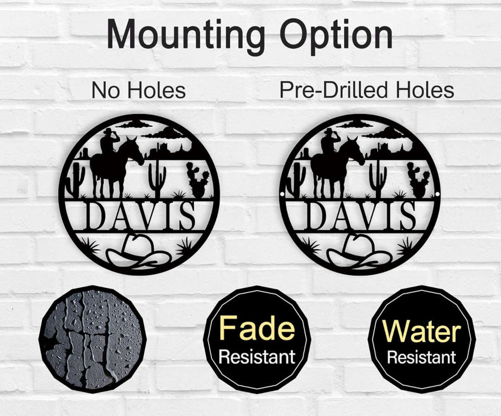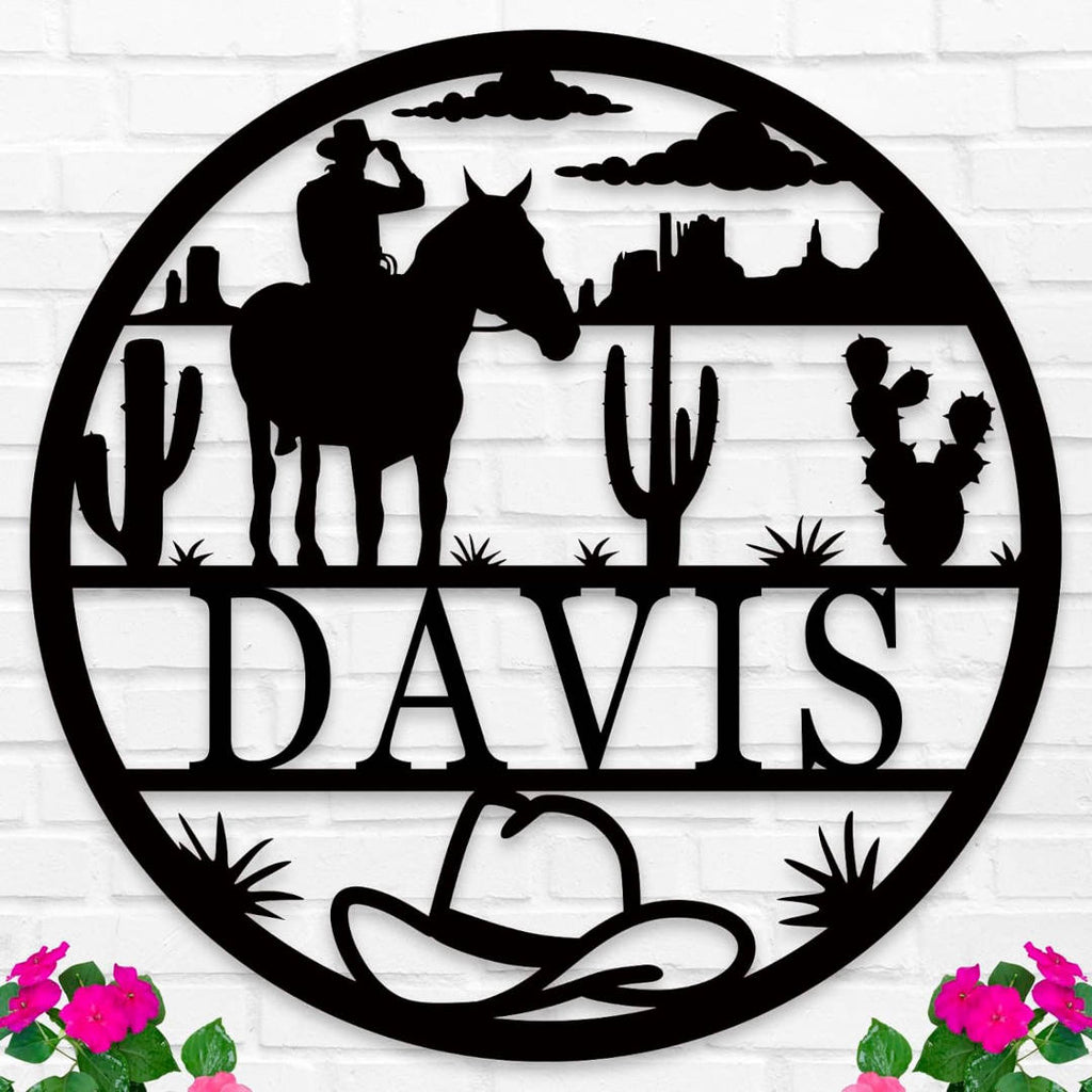 Capture the spirit of the Old West with this personalized cowboy metal sign. Featuring a striking silhouette of a cowboy on horseback, desert scenery, and your custom name, it’s the perfect centerpiece for any farmhouse, ranch, cabin, or Western-themed room. Made from premium steel and precision laser-cut for crisp detail, each piece is powder-coated for long-lasting durability indoors or outdoors. Multiple sizes and color finishes are available to match your space. Pre-drilled mounting holes make installation simple and secure. Add a rugged, personal touch to your space with this custom Western wall décor.