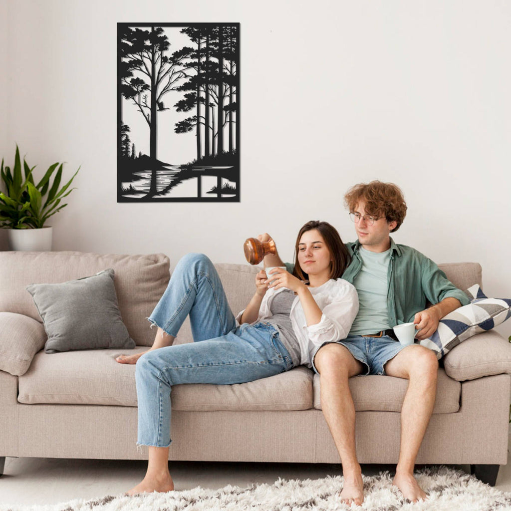 Bring the beauty of the outdoors into your home with this forest metal wall art, crafted from premium steel and designed to last a lifetime. Featuring a serene woodland scene with tall trees, a flowing river, and a flying bird, it adds natural elegance and tranquility to any space. Each piece is laser cut with precision and finished in your choice of powder-coated color for a durable, weather-resistant finish. Available in multiple sizes, this wall art fits perfectly in living rooms, cabins, entryways, or even outdoor spaces. Optional pre-drilled holes make installation simple and hassle-free, indoors or outdoors.