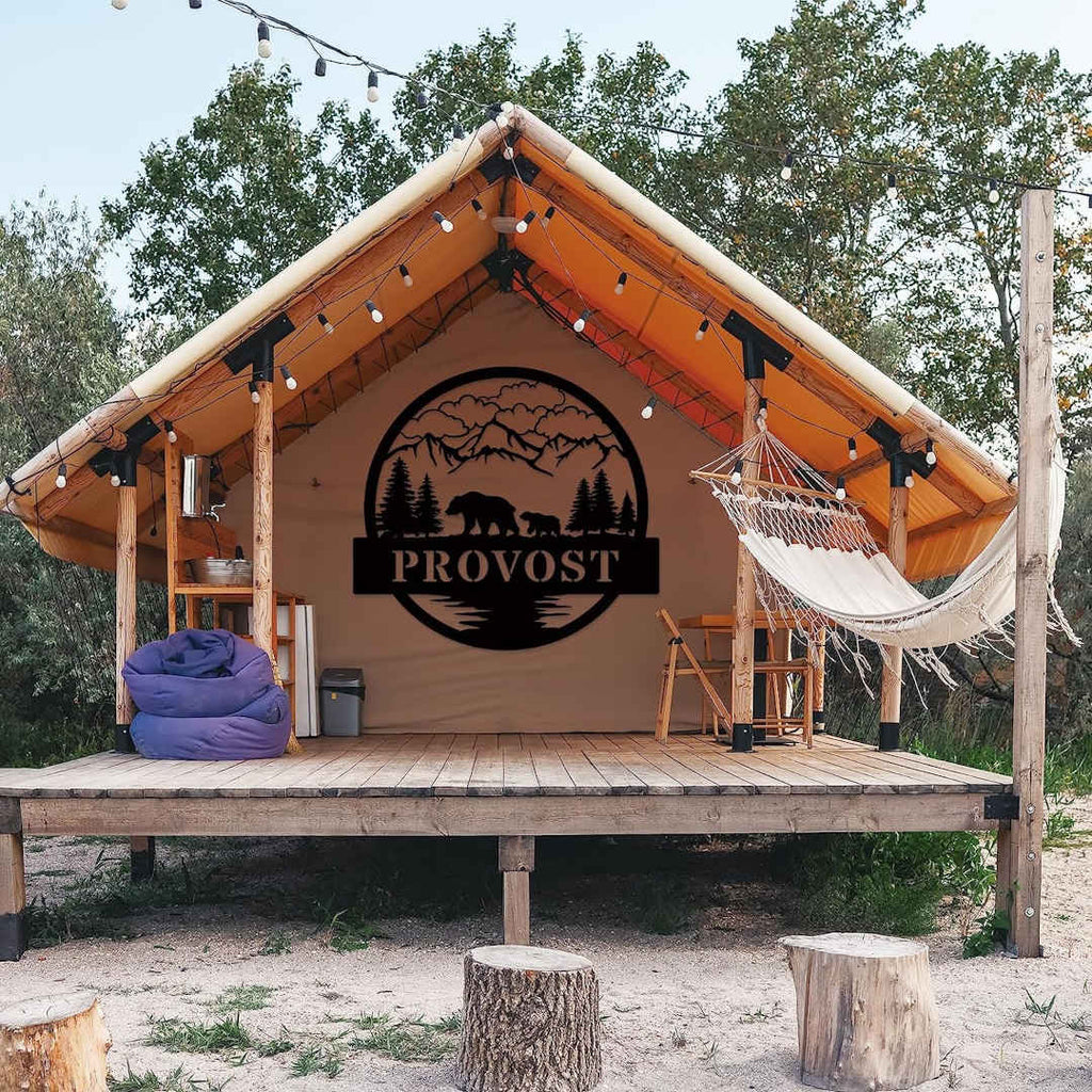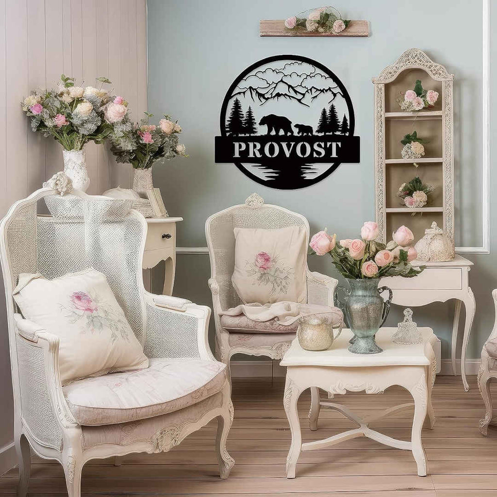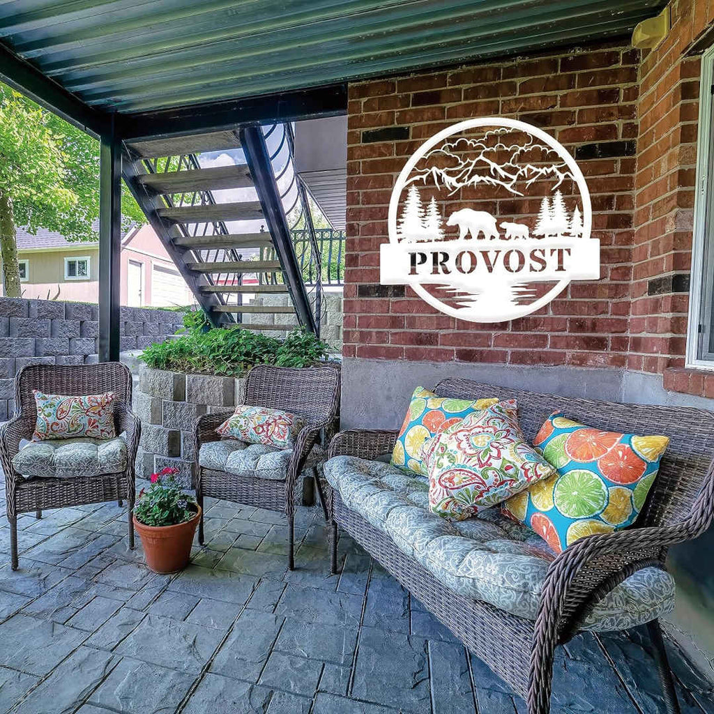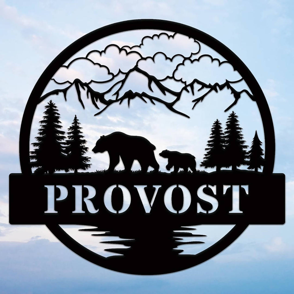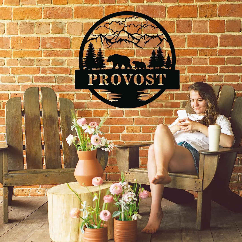Bring the serenity of the great outdoors to your home with this custom Bear Mountain metal sign. Featuring a mother bear and cub walking among pine trees beneath majestic mountain peaks and swirling clouds, this nature-inspired design is laser-cut from premium steel for clean, durable lines. The powder-coated finish protects against rust and fading, making it perfect for indoor or outdoor display. Personalize the name for your family, cabin, or lodge to create a truly meaningful piece of wall décor. Available in multiple sizes and colors, with pre-drilled holes for easy hanging, it's a stunning tribute to rustic living.