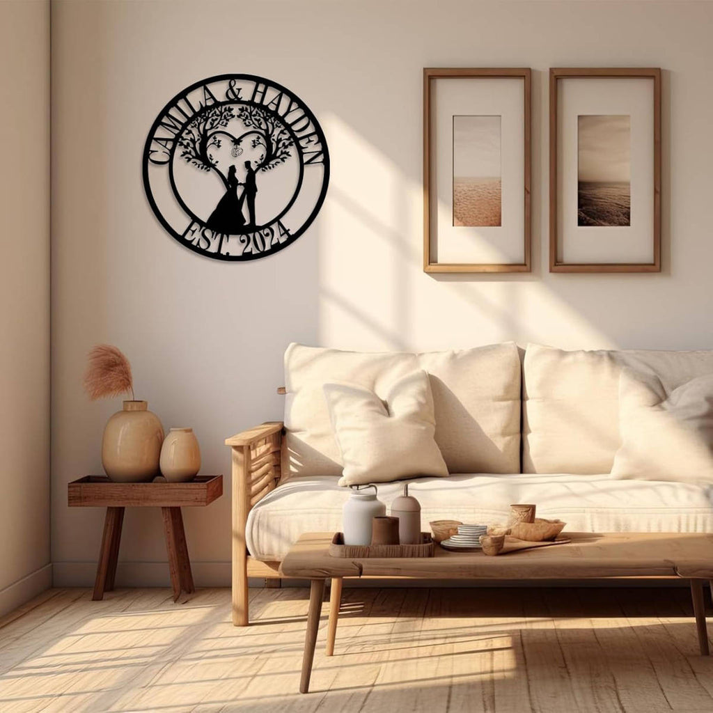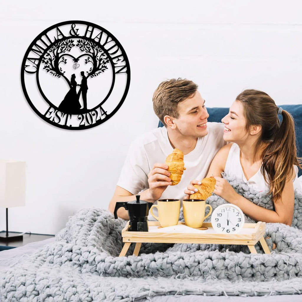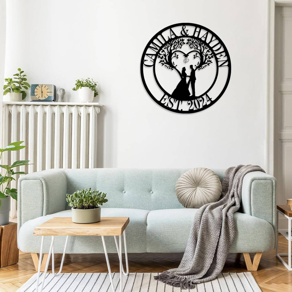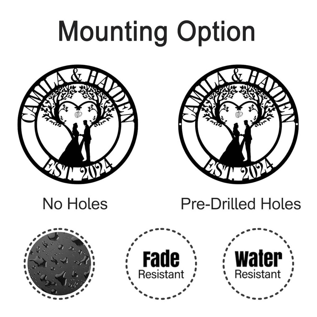 Celebrate the love and unity of a special couple with this beautifully crafted Wedding Couple Metal Sign. Made from sturdy 14-gauge steel, this custom decor piece is laser-cut with intricate details, featuring a romantic silhouette of a couple beneath two trees forming a heart shape. The intertwined wedding rings at the top symbolize eternal love, making this sign a perfect representation of a lifelong bond. Personalize it with the couple’s names and the year of their union to create a meaningful keepsake that will be cherished for years to come. Available in multiple sizes and colors, this sign can be customized to match any home decor or wedding theme. The powder-coated finish ensures durability, making it suitable for both indoor and outdoor display. With pre-drilled holes, it’s easy to mount on any wall or surface, making it a versatile addition to your home or as a unique gift for weddings, anniversaries, or other special occasions.