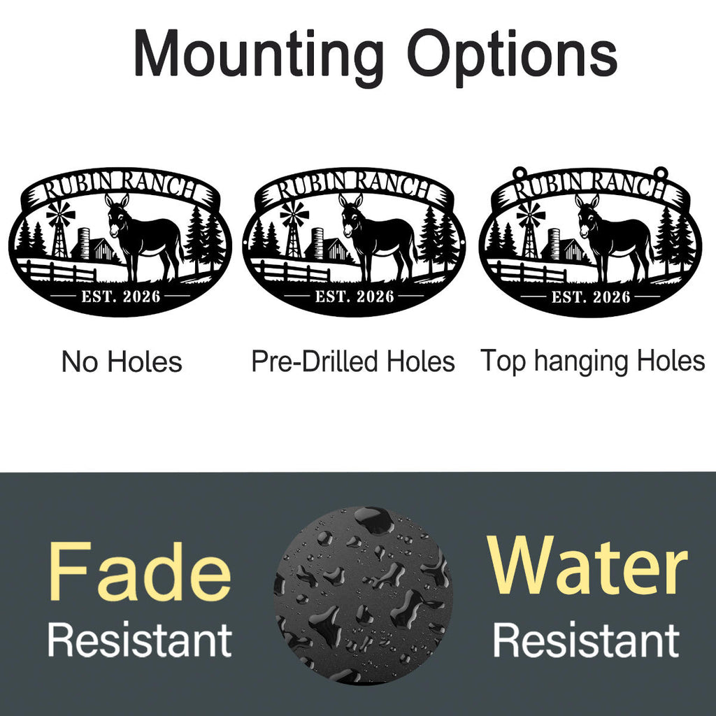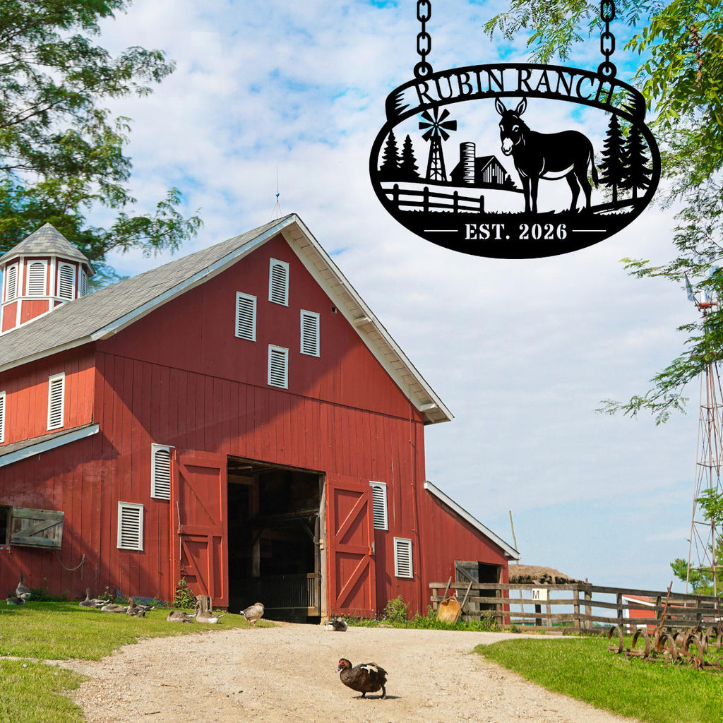 Bring rustic charm and personality to your property with this custom donkey ranch metal sign. Featuring a beautifully crafted farm scene with a donkey, windmill, barn, and trees, this design captures the warmth of country living while making your space uniquely yours. Precision laser-cut from durable 14-gauge steel, each sign is built to last and finished with a premium powder coating for long-term indoor or outdoor use. The bold silhouette ensures excellent visibility from a distance, making it perfect for entrances, gates, barns, or home décor. Customize the top name and bottom text to create a one-of-a-kind piece that reflects your family, ranch, or farm identity. Multiple sizes and color options allow you to match your exact style. Pre-drilled holes make installation quick and easy.