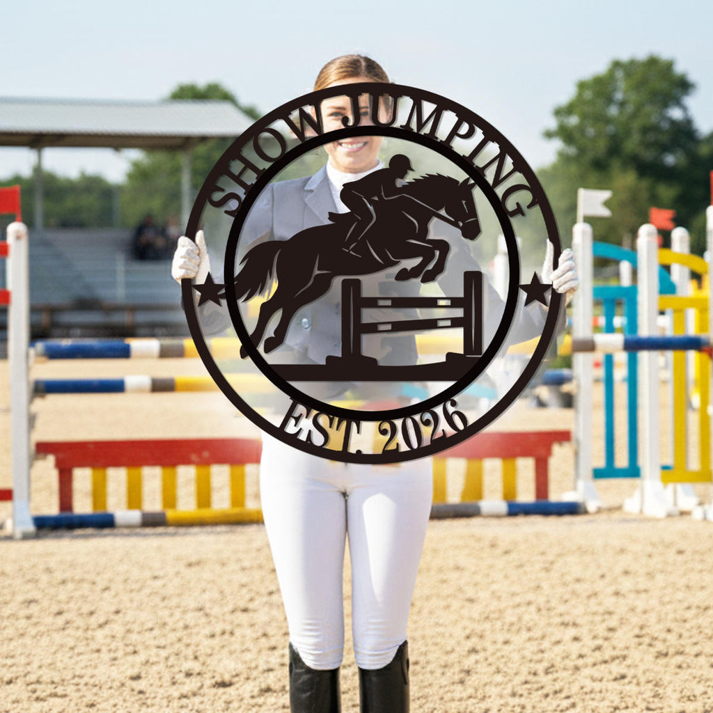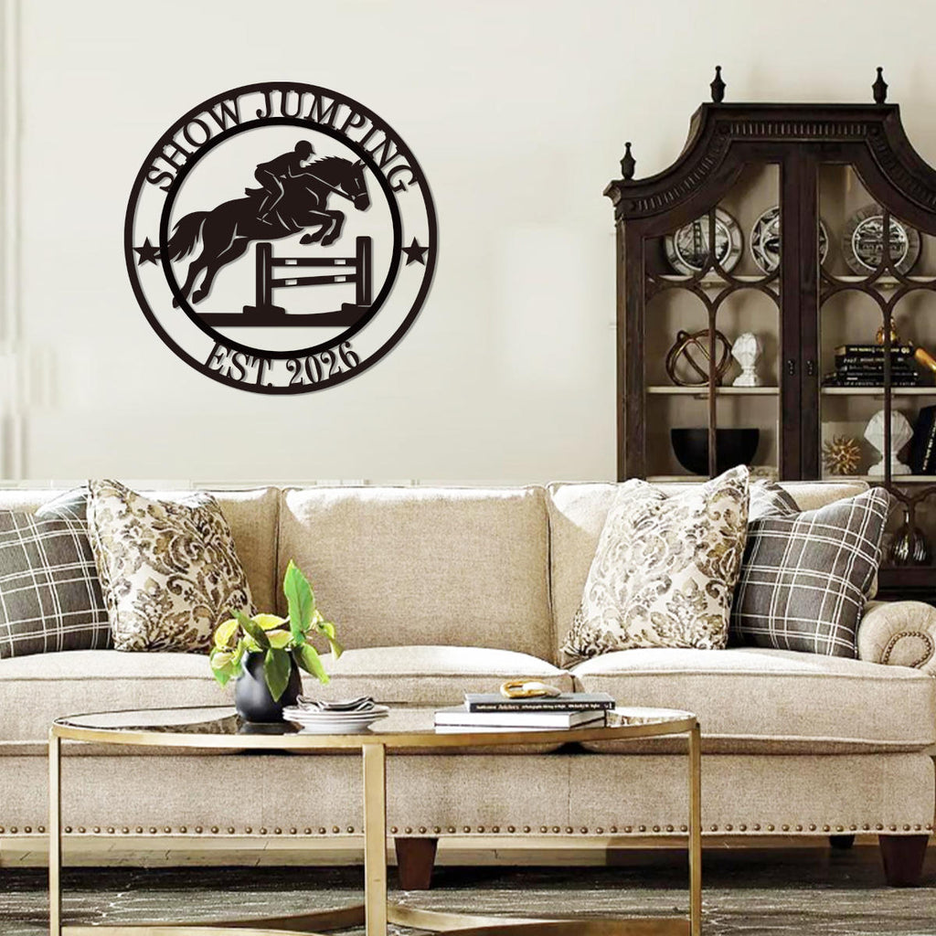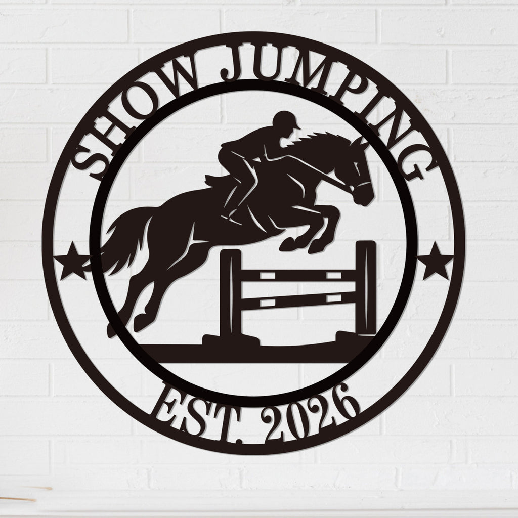 Bring timeless equestrian style to your space with this custom jumping horse metal sign. Designed with a bold show jumping silhouette and a clean circular layout, this piece captures the strength, motion, and elegance of horse sports. Crafted from durable steel and finished with a weather-resistant coating, it’s suitable for both indoor and outdoor display. Perfect for barns, stables, farms, or equestrian homes, this sign adds a personal and professional touch to any setting.