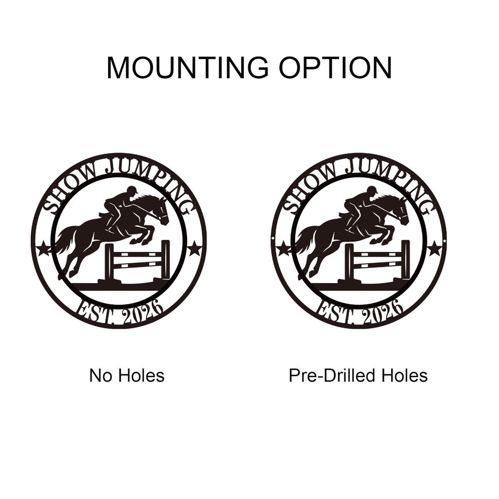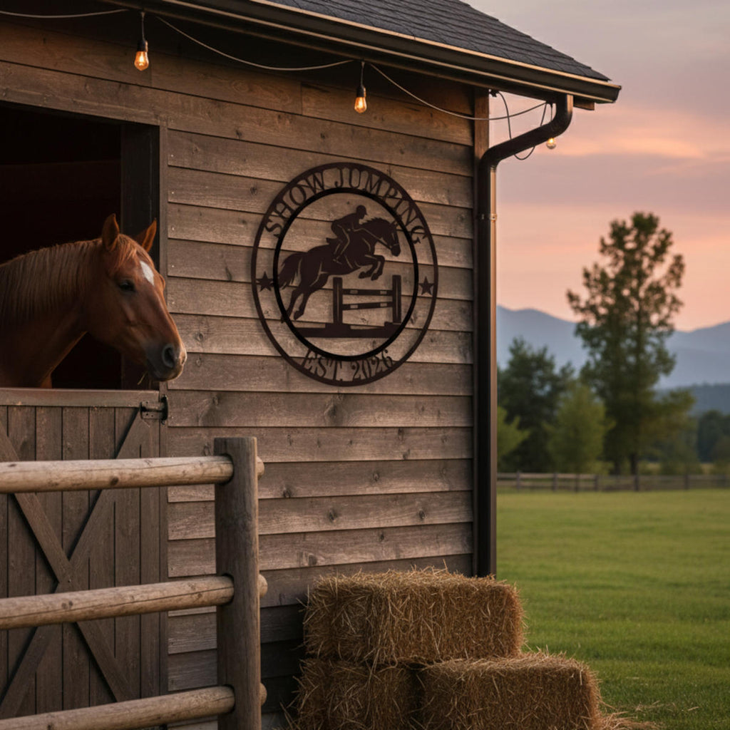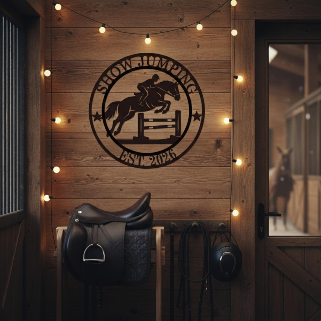 Bring timeless equestrian style to your space with this custom jumping horse metal sign. Designed with a bold show jumping silhouette and a clean circular layout, this piece captures the strength, motion, and elegance of horse sports. Crafted from durable steel and finished with a weather-resistant coating, it’s suitable for both indoor and outdoor display. Perfect for barns, stables, farms, or equestrian homes, this sign adds a personal and professional touch to any setting.