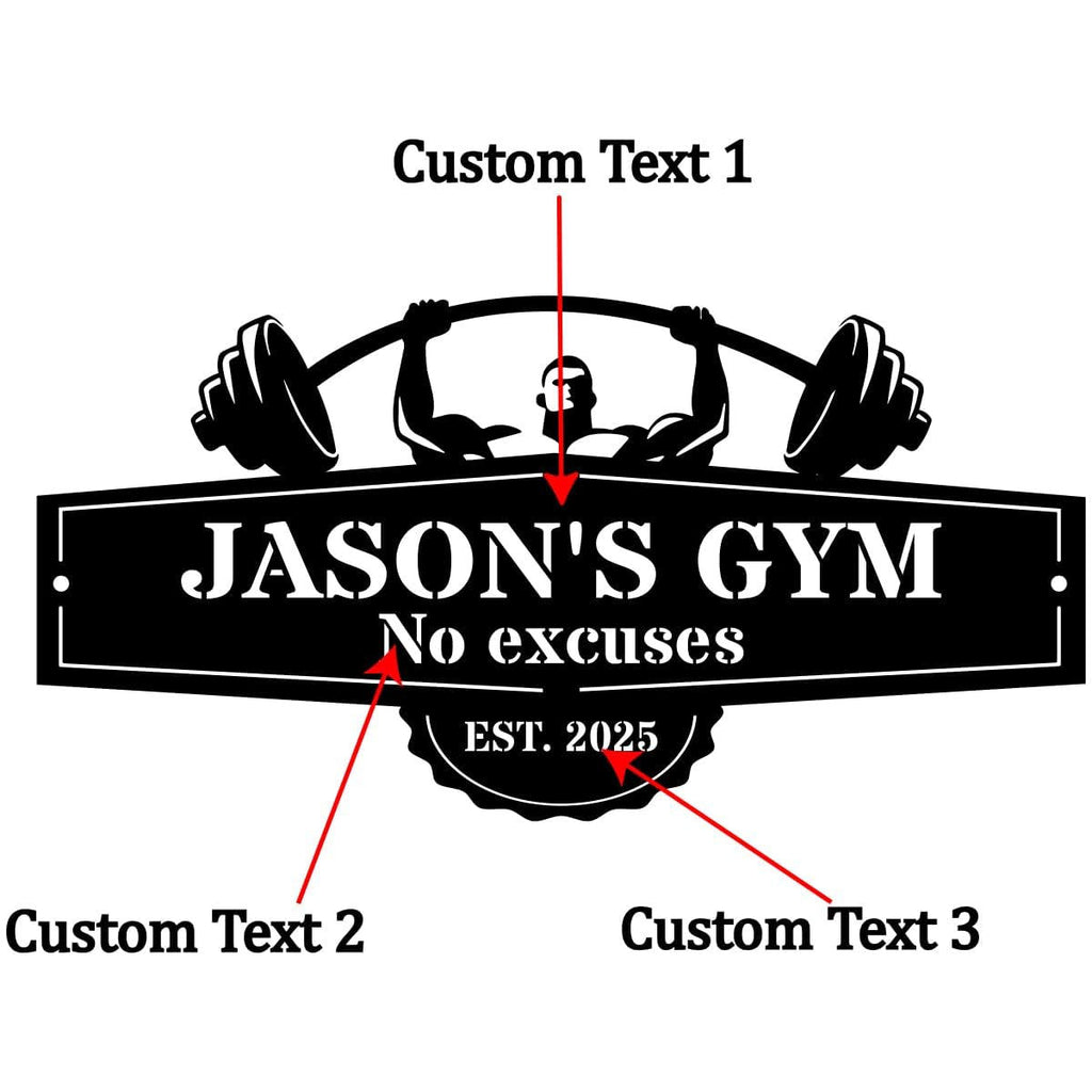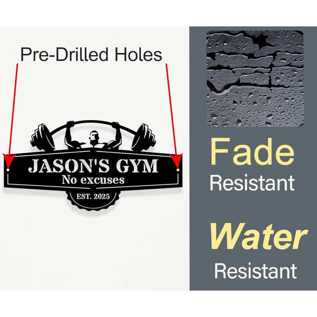 Create a powerful statement in your workout space with this personalized metal gym sign. Designed with a strong barbell lifter silhouette and bold lettering, this sign brings motivation and attitude to any home gym, garage, or training room. Each piece is precision laser cut from heavy-duty steel and finished with a durable powder coating for long-lasting indoor or outdoor use. Customize the name, message, and established year to make it truly yours. Multiple sizes and color options allow you to match your space perfectly. Optional pre-drilled holes make installation quick and easy. Whether for personal motivation or as a unique gift, this custom gym sign is built to inspire strength and commitment every day.