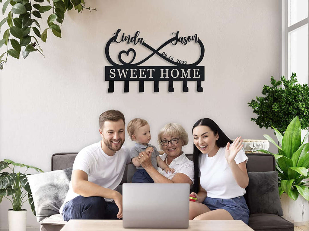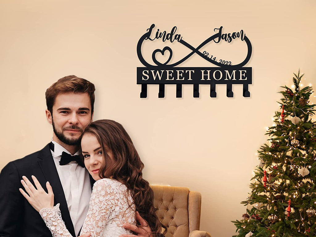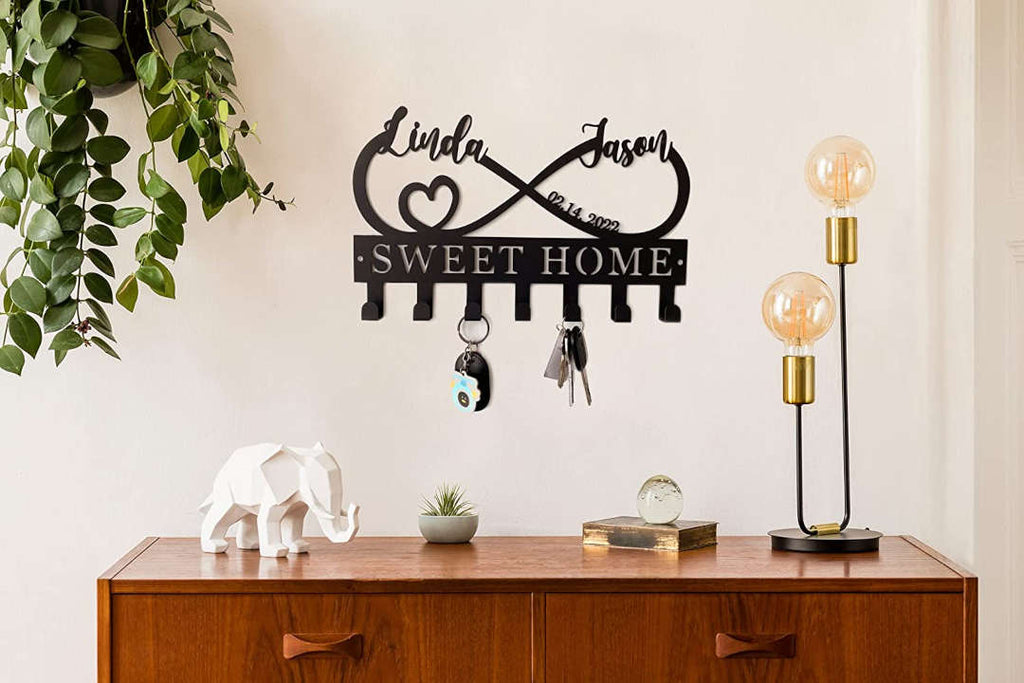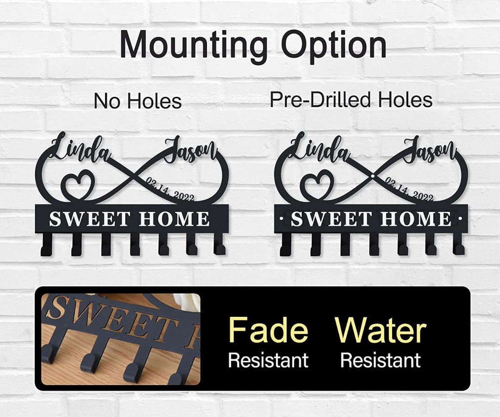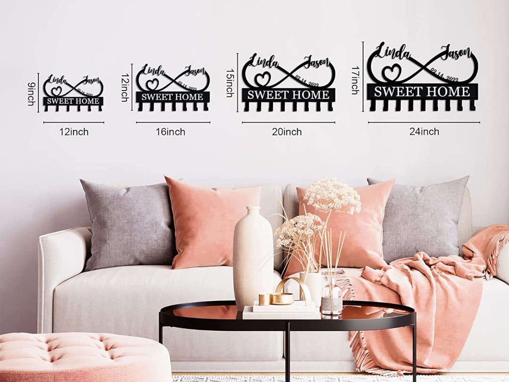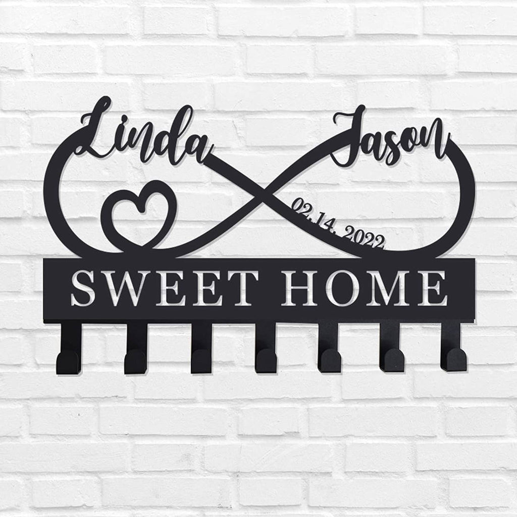 Discover the perfect blend of functionality and romance with our Metal Infinity Key Hooks. Crafted from durable 14-gauge steel, each piece is meticulously laser-cut, undergoes thorough surface cleaning, and receives a powder coat finish for lasting quality. The design features an elegant infinity symbol, allowing you to personalize it with couple names and a memorable date. Below, multiple hooks offer ample space for keys, while a custom greeting adds a personal touch. Choose from various sizes and colors to suit your style.