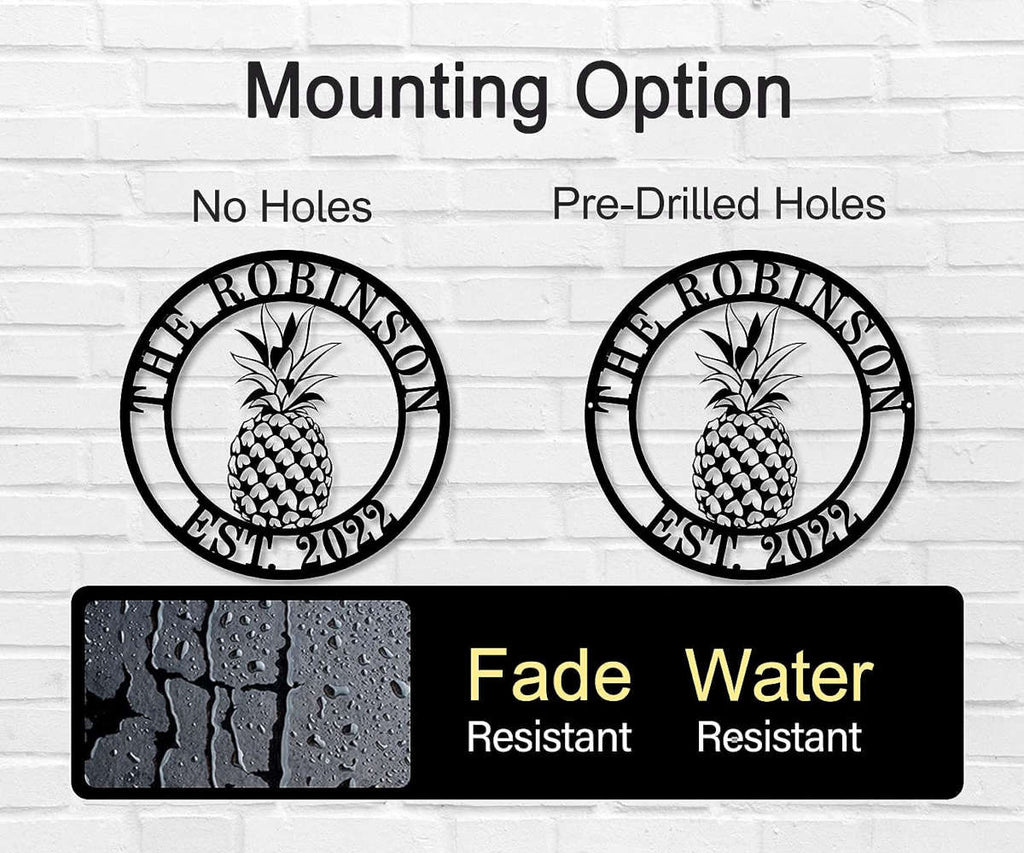Elevate your space with our exquisite Personalized Pineapple Iron Sign! Crafted with precision, this circular iron sign features a charming pineapple design at its center, surrounded by customizable edges for your name, established year, and more. Perfect for adding a touch of tropical elegance to any room, this sign is a testament to quality craftsmanship and personalized decor.