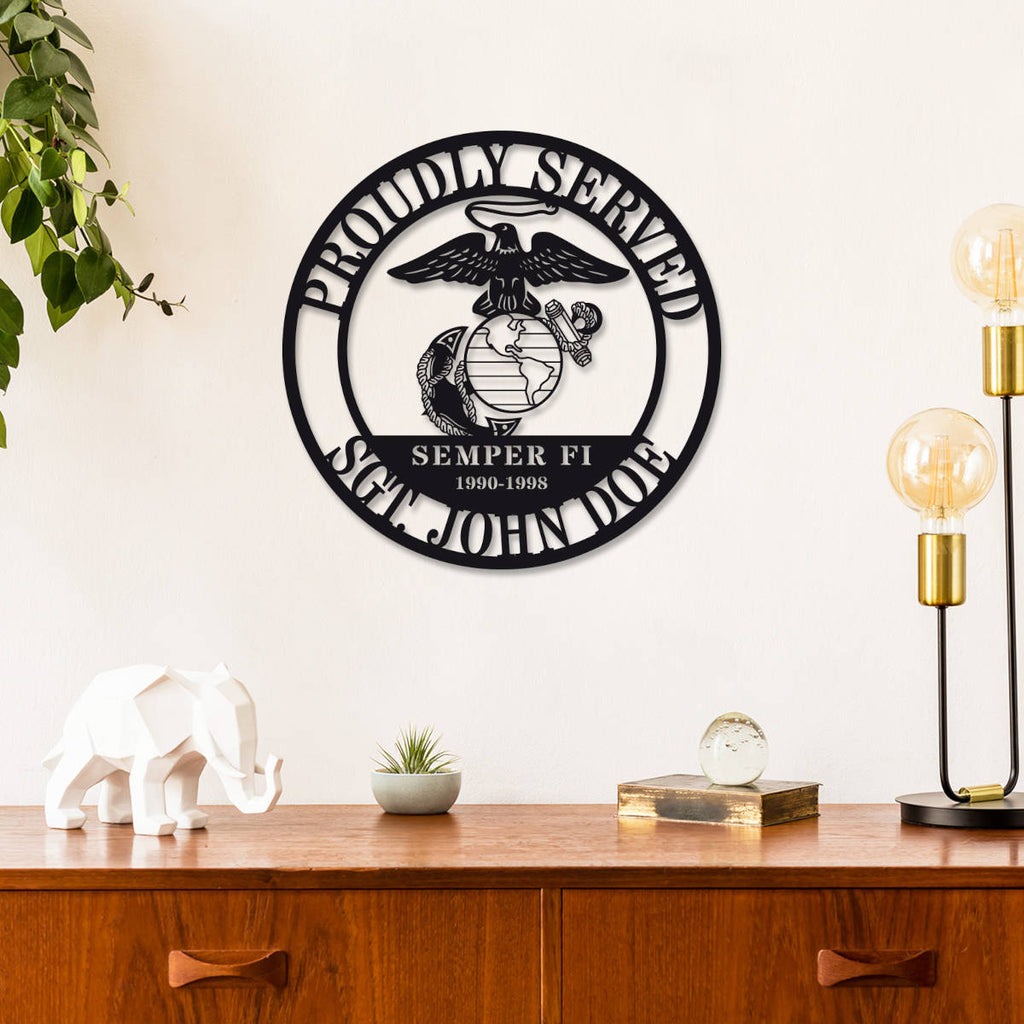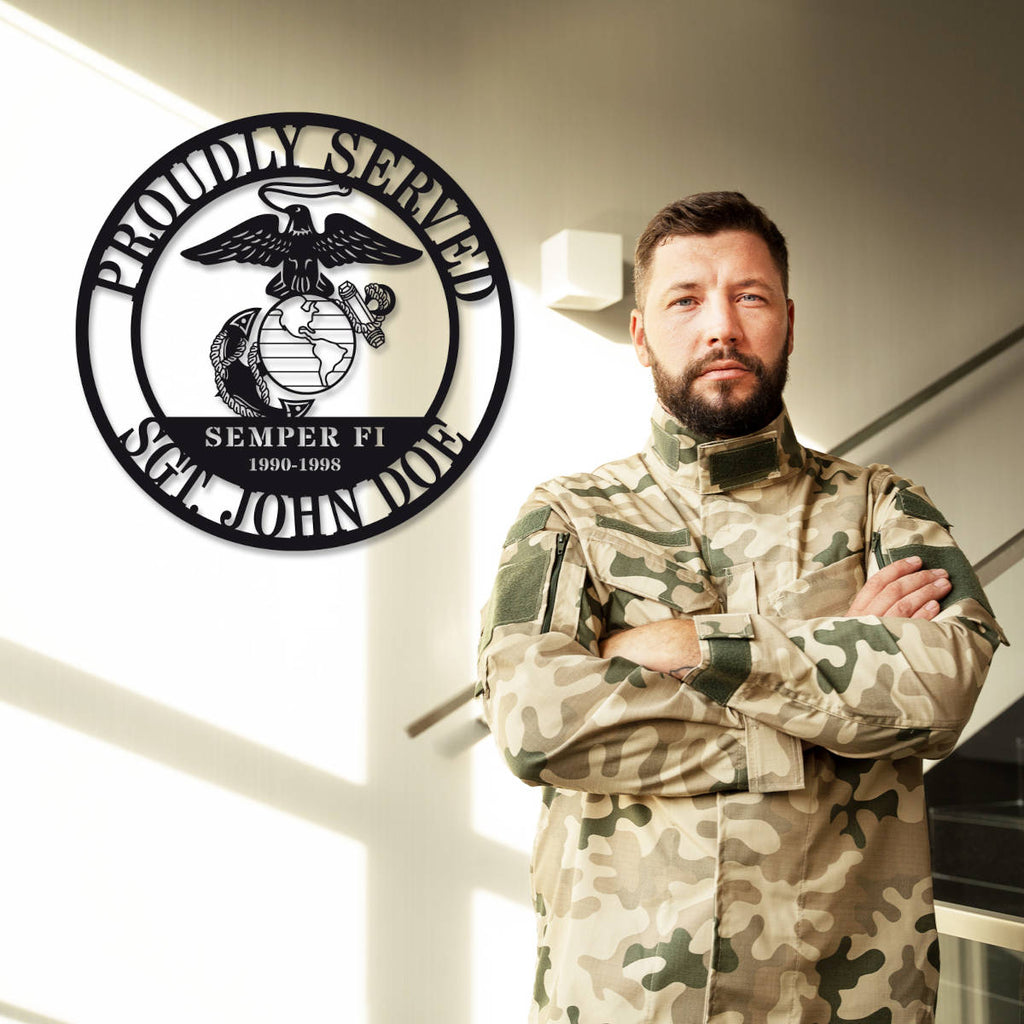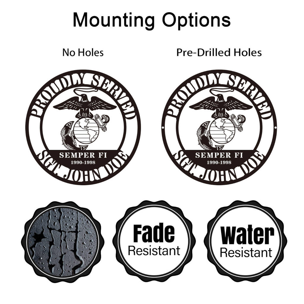 Celebrate the honor and legacy of military service with this custom Marine Corps metal plaque. Featuring the official Eagle, Globe, and Anchor emblem along with bold “SEMPER FI” lettering and fully customizable name and service years, this plaque is precision-cut from premium steel. Each piece undergoes laser cutting, surface cleaning, and powder coating for lasting durability indoors or outdoors. Multiple sizes and colors are available, and optional pre-drilled holes make wall mounting easy. It's a meaningful way to honor service, sacrifice, and Marine pride.