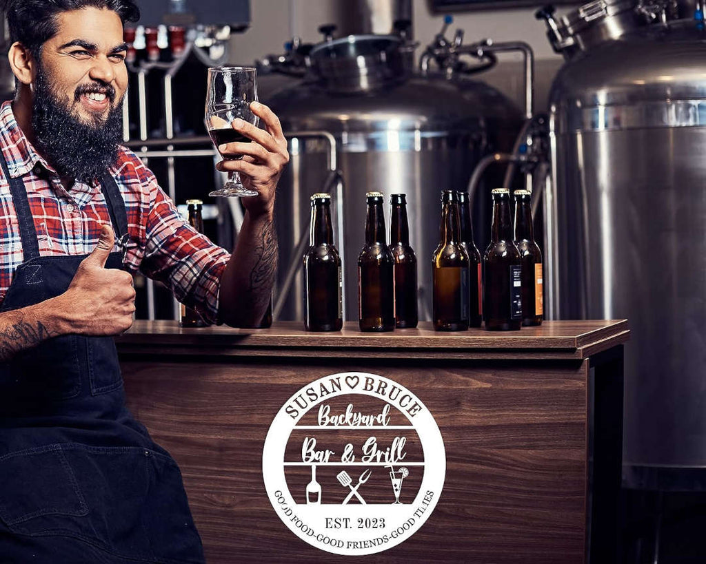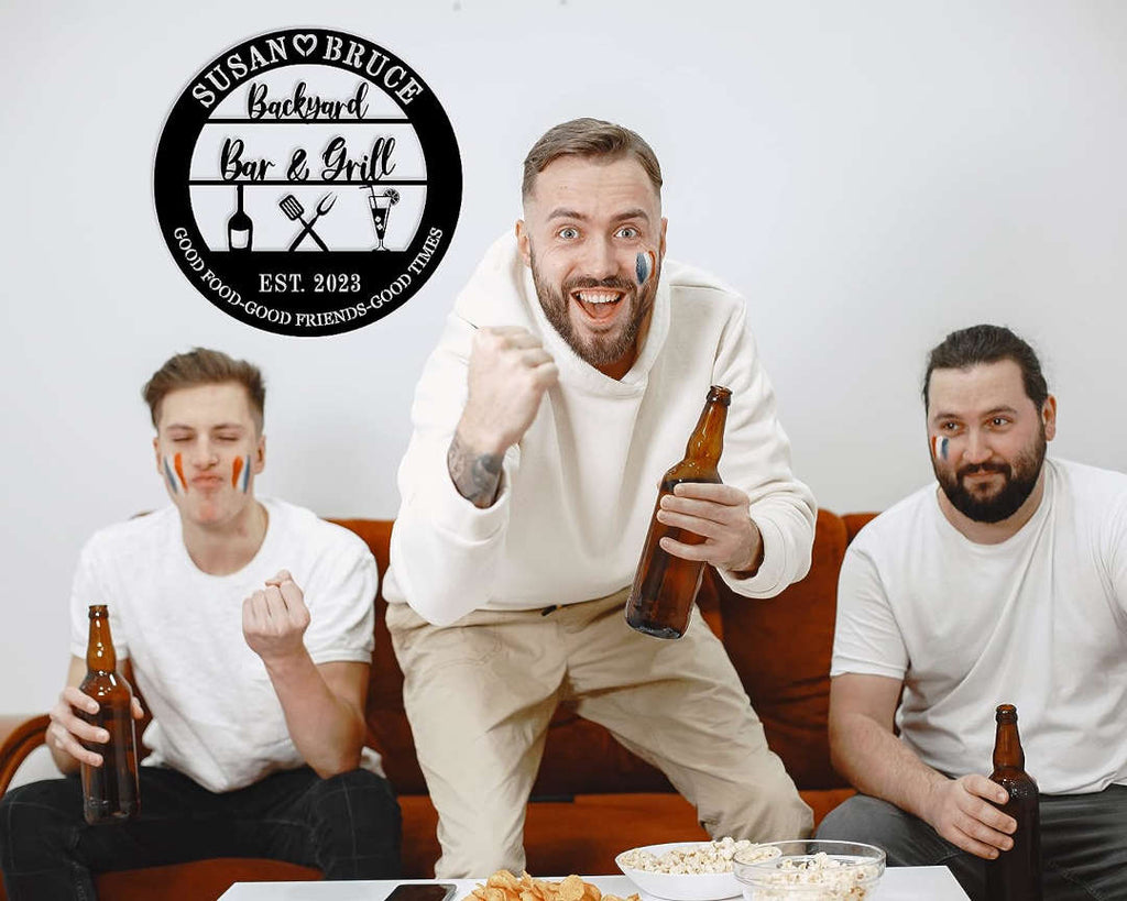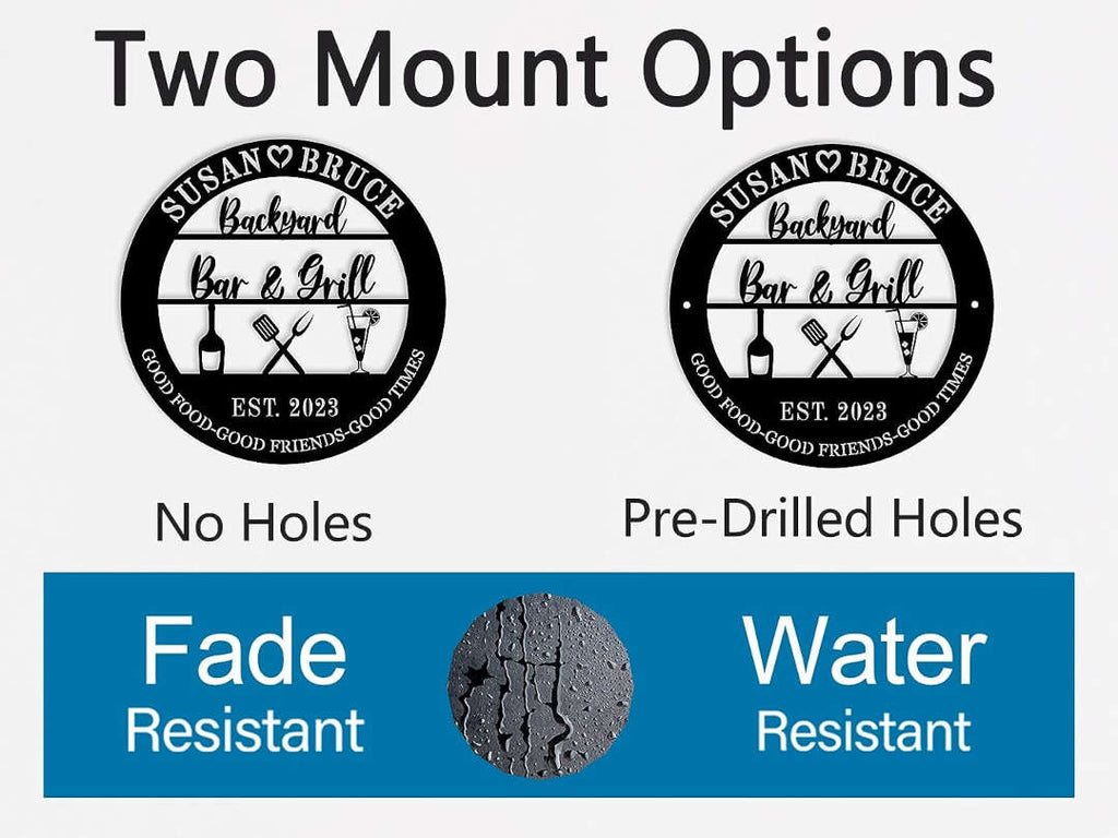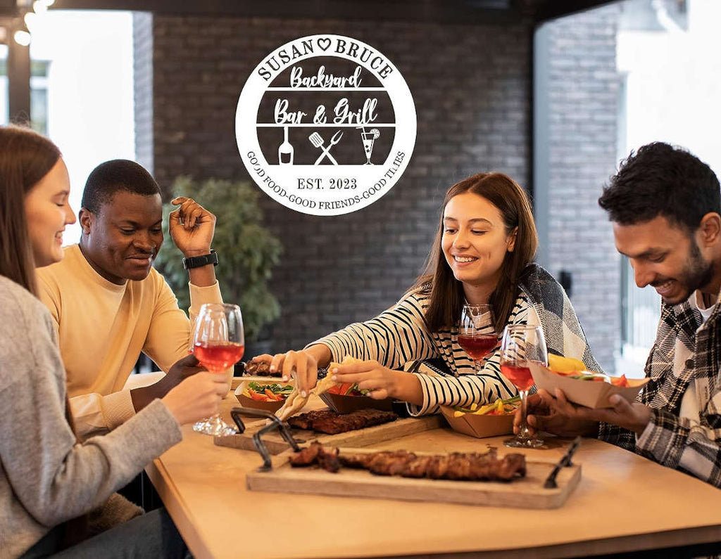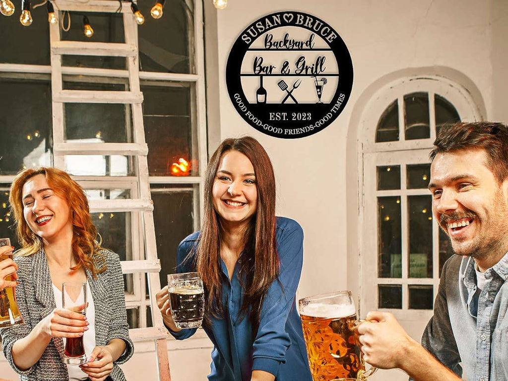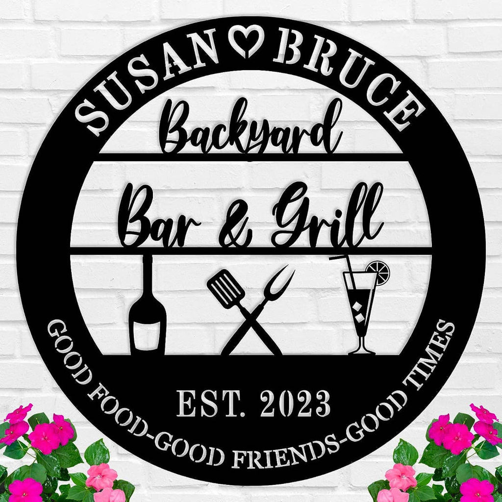 Add a personalized touch to your backyard gatherings with this custom metal Bar & Grill sign. Expertly laser-cut from premium steel, this round wall décor features grilling icons, drinks, and your custom names or date for a one-of-a-kind piece. Finished with a weather-resistant powder coating in your chosen color, it's perfect for outdoor use year-round. Available in various sizes, this sign includes optional pre-drilled holes for easy hanging on fences, patios, or outdoor kitchens. Ideal for family barbecues, casual entertaining, or gifting to grill masters and outdoor hosts.