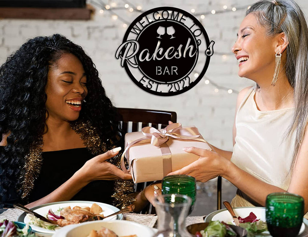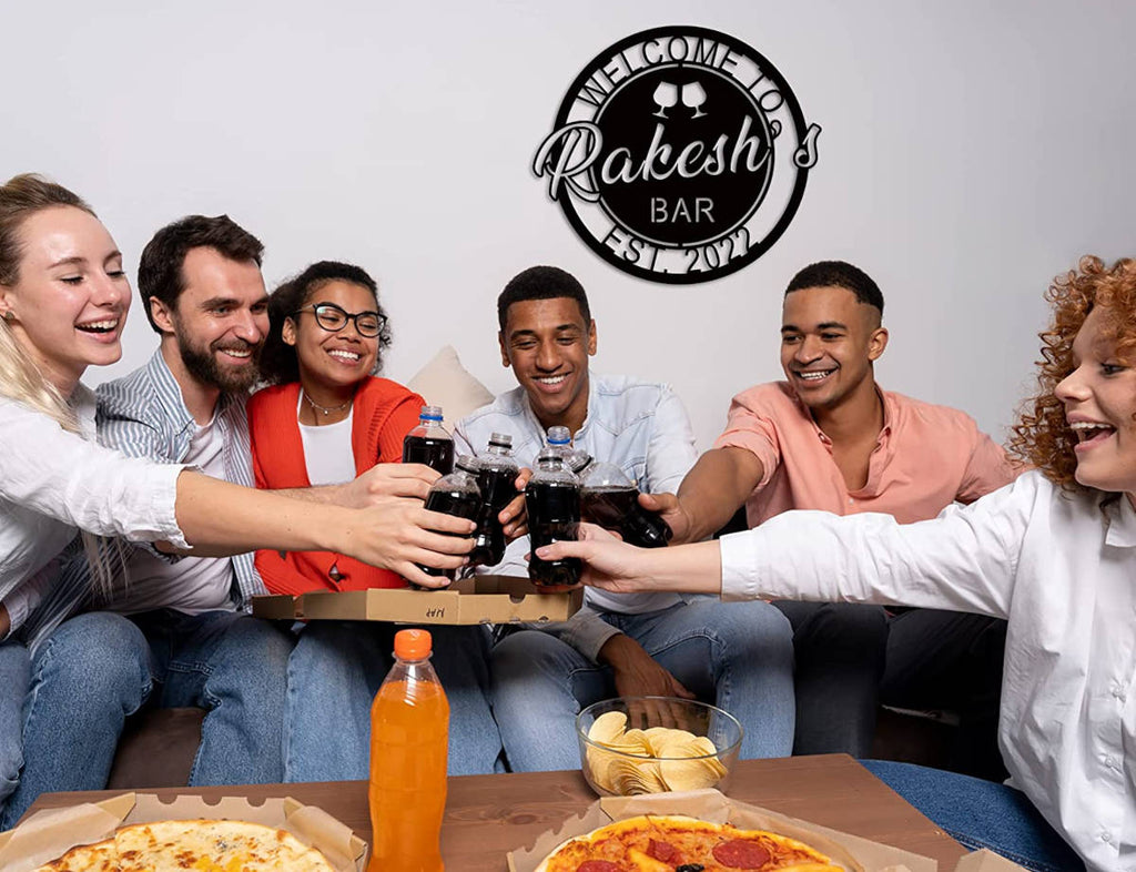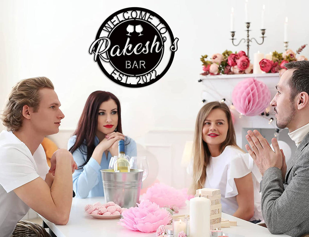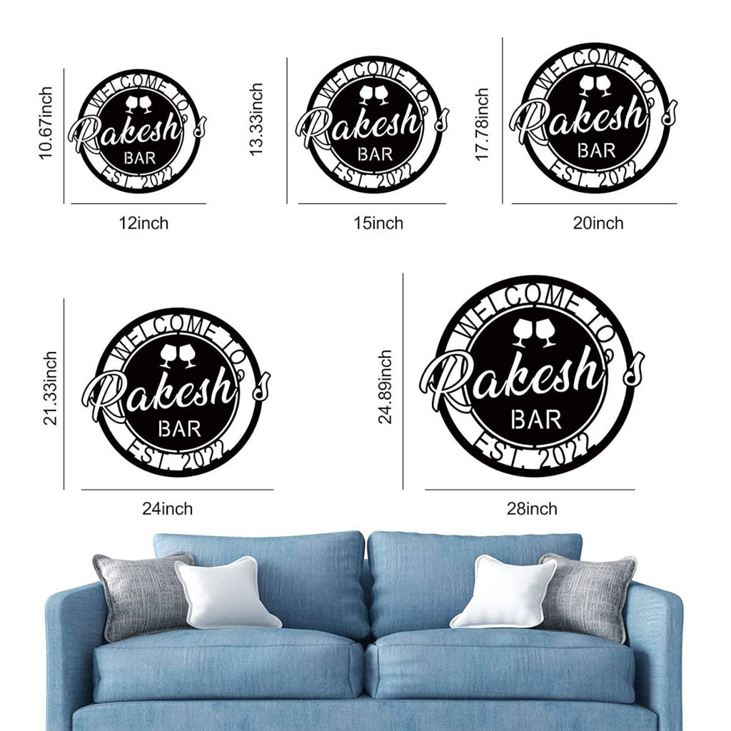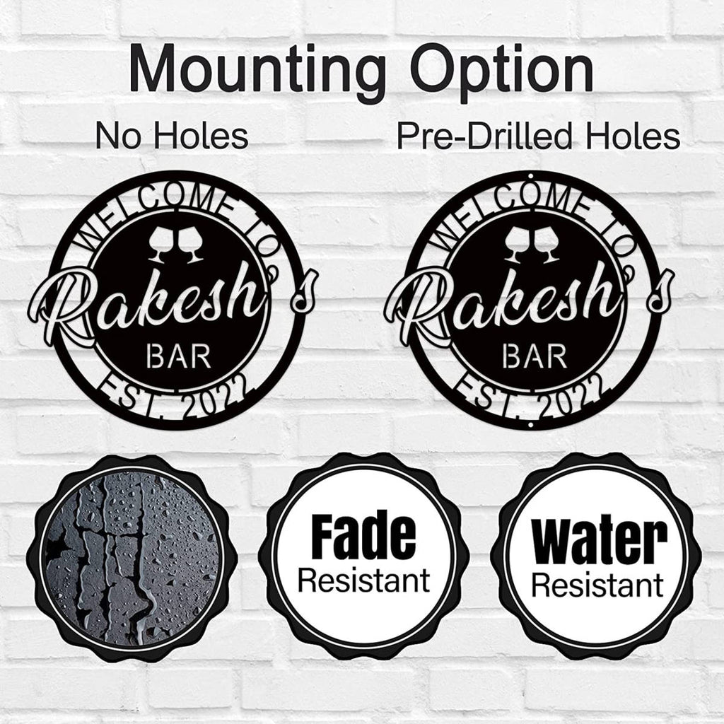 Create a welcoming atmosphere in your home or commercial bar with this custom metal sign. Made from 14-gauge steel, this durable sign is laser-cut to ensure precise detailing and a clean finish. After the cutting process, the surface is thoroughly cleaned and powder-coated, providing a weather-resistant and long-lasting finish that will look great indoors or outdoors. The circular design features the text "Welcome to Rakesh's Bar" and "Est. 2022," along with two clinking glasses, symbolizing celebration and hospitality. All text is customizable, allowing you to personalize the sign with your name or a special date, making it a unique addition to your bar or a fantastic gift for friends or family. With multiple size and color options, this sign can be tailored to fit any space. Pre-drilled holes make it easy to securely mount on a wall, ensuring it becomes a permanent fixture in your bar area. Whether you're a home bar enthusiast or a professional mixologist, this sign is the perfect way to add a personalized touch to your space.