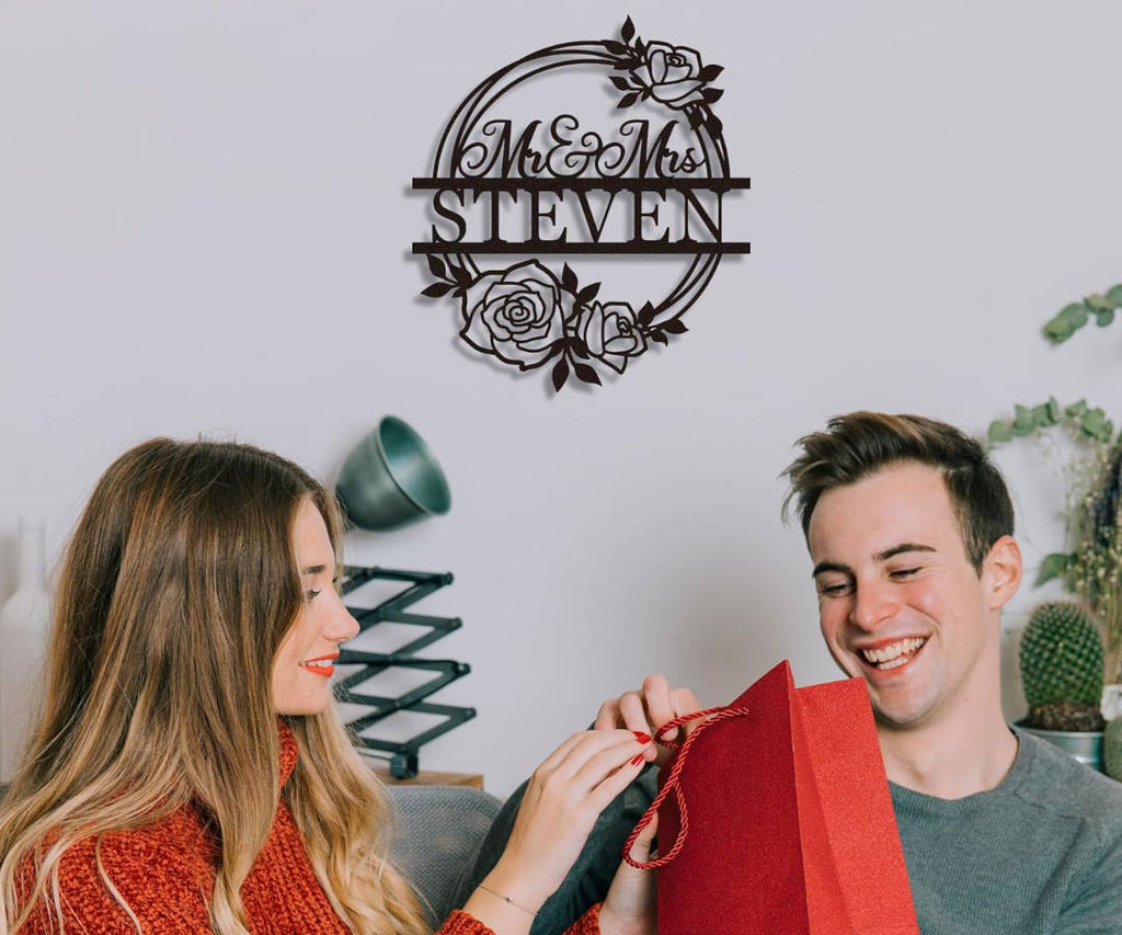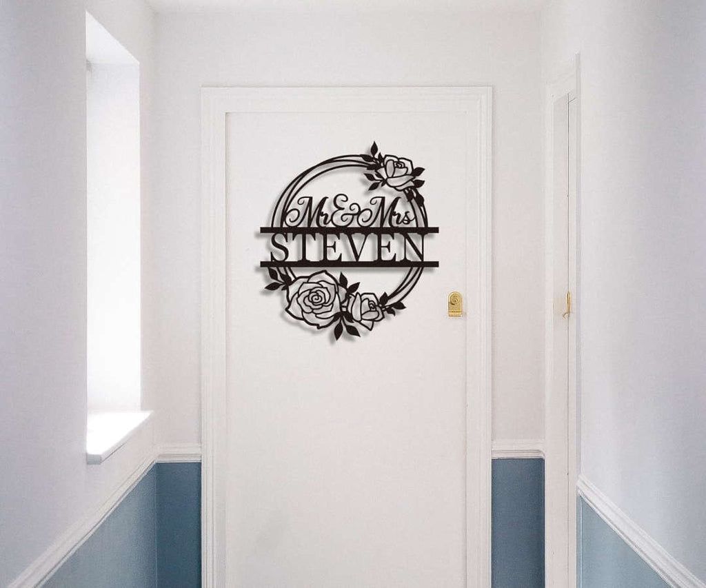 Enhance your home decor with our personalized steel rose wreath. Crafted from robust 14-gauge steel, this exquisite piece is available in multiple sizes and colors, ensuring it perfectly complements your space. Our meticulous process includes laser cutting, surface cleaning, and powder coating. Add an elegant touch to your home, weddings, or anniversaries with 'Mr & Mrs' or custom text.