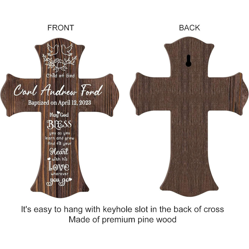 • Deserves Celebrating Memories: Our personalized solid wood cross will showcase your special moments and serve as a reminder of those precious memories they cherish so much. It is customized with your name and date on the front of cross as a personalized baptism gift to the event that deserves celebrating!