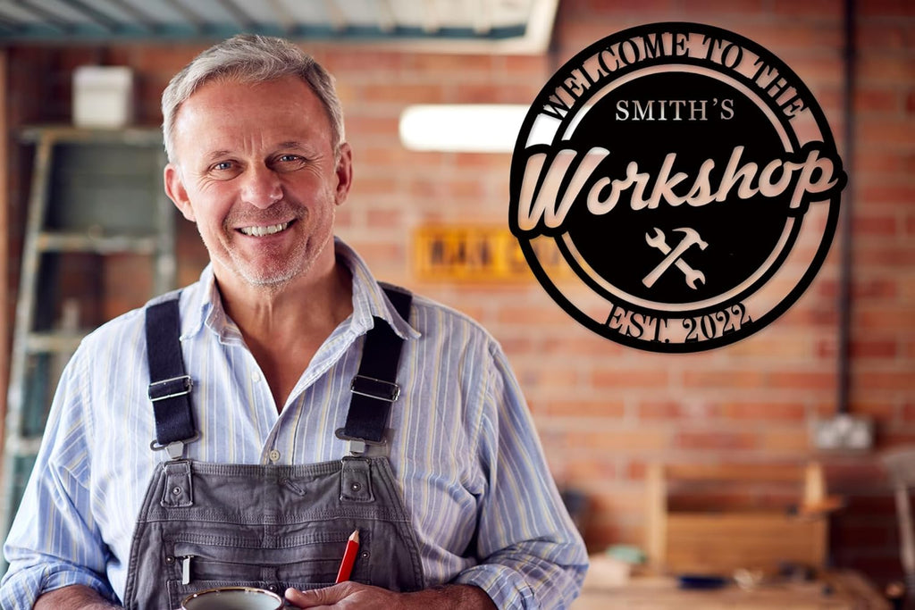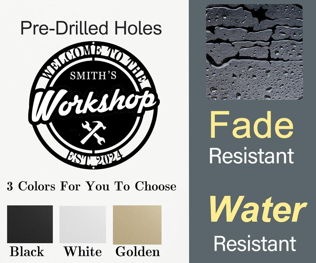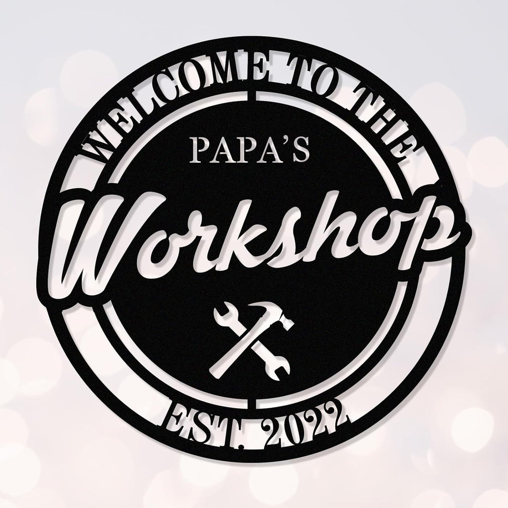 Elevate your workshop, garage, or man cave with our custom metal art. Featuring a circular design, laser-cut images of hammers and wrenches add industrial charm. Personalize with your name or establishment year for a unique touch. Perfect for adding character to any workspace. Our products undergo precision laser cutting, surface cleaning, and powder coating for durability. Available in various sizes and colors, with pre-drilled holes for easy wall mounting.