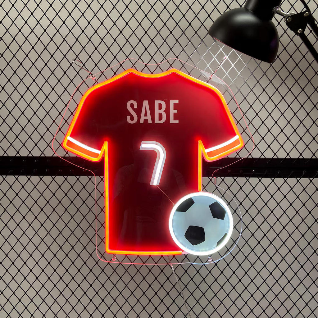Create a unique soccer atmosphere with this customizable LED neon sign designed as a glowing jersey with a soccer ball. You can personalize the name and the player number and choose from multiple styles inspired by real soccer jerseys. The bright LED strips provide the classic neon look but remain safe, energy-efficient, and extremely durable. It comes ready to hang and works perfectly as a wall decoration in gaming rooms, kids’ bedrooms, sports corners, or man caves. It is also a popular gift for boys, teens, and soccer enthusiasts. Just choose your size, pick a style, add your custom name and number, and enjoy a glowing soccer moment every day!