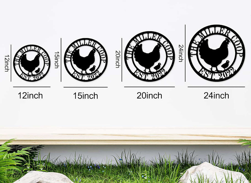 Add a personalized touch to your chicken coop with this Custom Chicken Coop Sign. Made from high-quality 14-gauge steel, this sign is expertly laser-cut and powder-coated to ensure durability and a beautiful finish. The design features a charming hen and chick silhouette, along with customizable text that can include your family name, establishment year, or any message of your choice. Available in multiple sizes and colors, this sign is perfect for adding a unique and rustic charm to your outdoor space. Pre-drilled holes make it easy to mount on any wall.